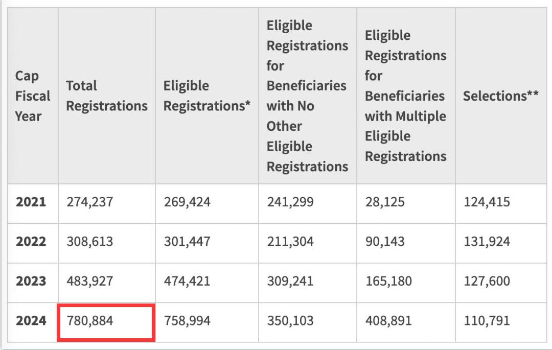 与往年相比,今年提交的H-1B注册数量激增。780,884份注册申请比去年483,927份,足足增长了约61.4%,中签率几乎再缩水一半,从去年的26.9%骤减到今年的14.2%。