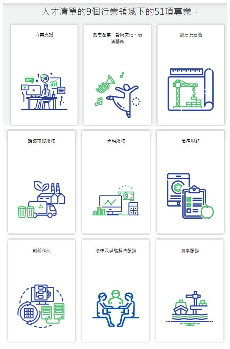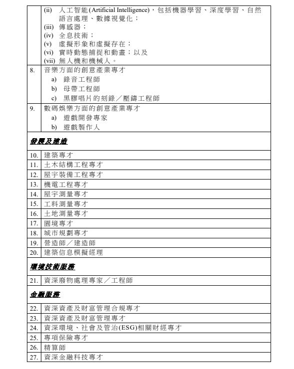 新清单中,涵盖9个行业领域下的51项专业,包括涉及医疗服务领域的13个医疗专业,如医生、牙医、护士等;发展及建造领域的11个专业工种,如建筑专才、土木工程专才、测量专才等;创意产业、艺术文化、表演艺术领域的8项专才,如出版、电影、音乐、数码娱乐方面的创意产业专才等。属于清单上的专才,申请人经评核后,可享有「优秀人才入境计划」的入境便利,即在「综合计分制」下获得30分额外分数。成功的申请者在来港前无需事先在港获得聘用,并可携同受养人来港定居。