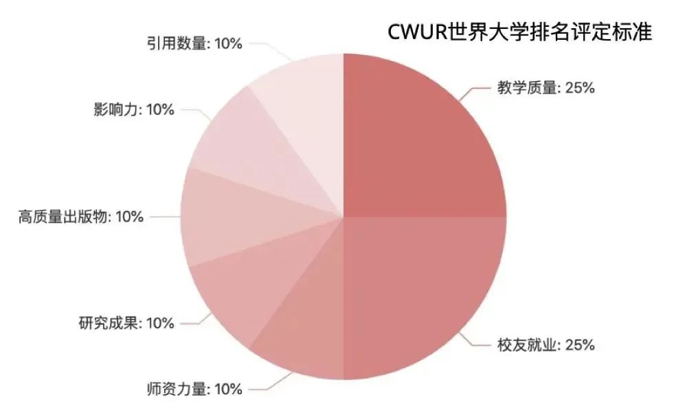 本次排名的参考主要分成4大因素——教育质量 (25%)、毕业校友就业情况 (25%)、师资力量 (10%) 和研究表现 (40%)。涵盖7大指标,具体包括: