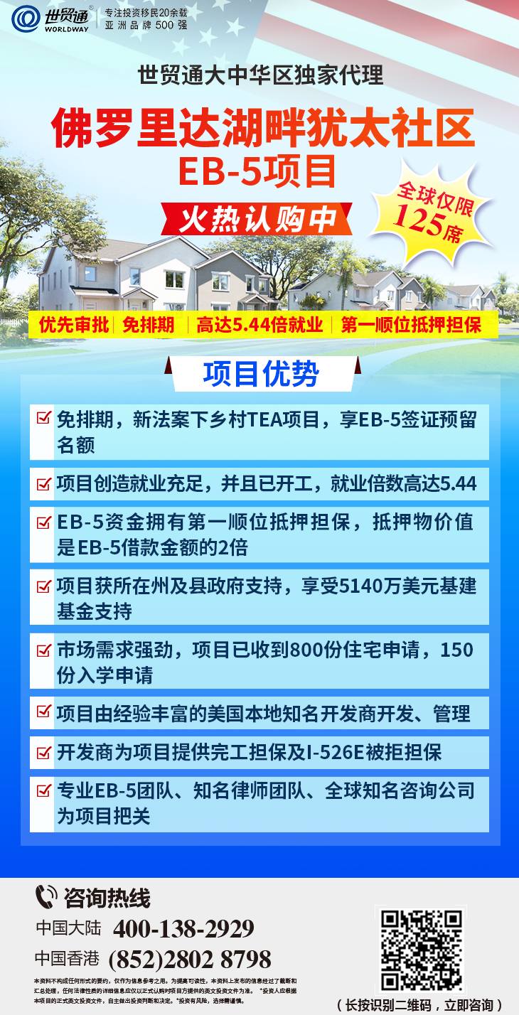 移民有两大关键要素——时机和选择!佛罗里达湖畔犹太社区EB-5项目正在火热抢购中,项目名额紧俏,认购从速,有意向的投资人需抓紧机会。更多详情,请在评论区私信我们,或拨打世贸通服务热线,中国大陆:400-138-2929 ,中国香港:(852)2802 8798。