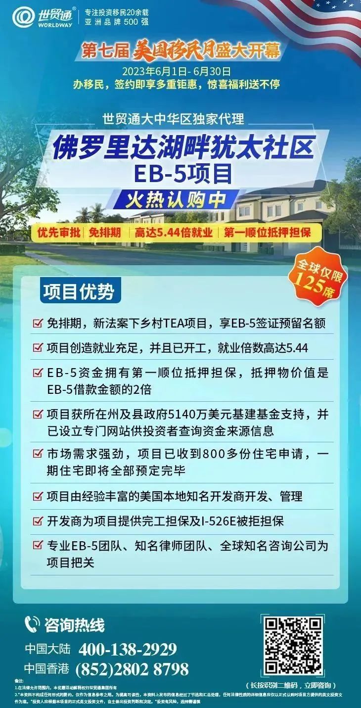 为了帮助投资人了解美国投资移民最新政策,以及怎样选择合适的项目,世贸通将在第七届美国移民月期间盛大举行EB-5免排期政策解析暨「佛罗里达湖畔犹太社区」乡村项目全国巡回推广会,2023年6月16日香港站,6月17日北京站、深圳站,6月18日上海站、青岛站,五城联动,届时美国知名移民律师、项目方高层等多位重磅嘉宾亲临解析!机会难得,精彩不容错过!