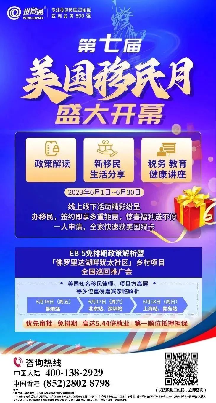 移民投资重在选择,贵在抢占先机!自「佛罗里达湖畔犹太社区」全国巡回发布会成功举办,反响异常热烈,掀起2023年美国EB-5投资移民抢购热潮之后,经过一轮又一轮火爆抢购,项目所剩名额越来越少。项目全球仅限125个名额,想要快速获美国绿卡的朋友,千万不要错过!认购名额逐日递减中,有意向的投资人要抓紧时间了。即日起,认购「佛罗里达湖畔犹太社区」EB-5项目,还可享受世贸通6月举办的“第七届美国移民月”活动,签约即享重磅钜惠!具体详情请与世贸通顾问联系。