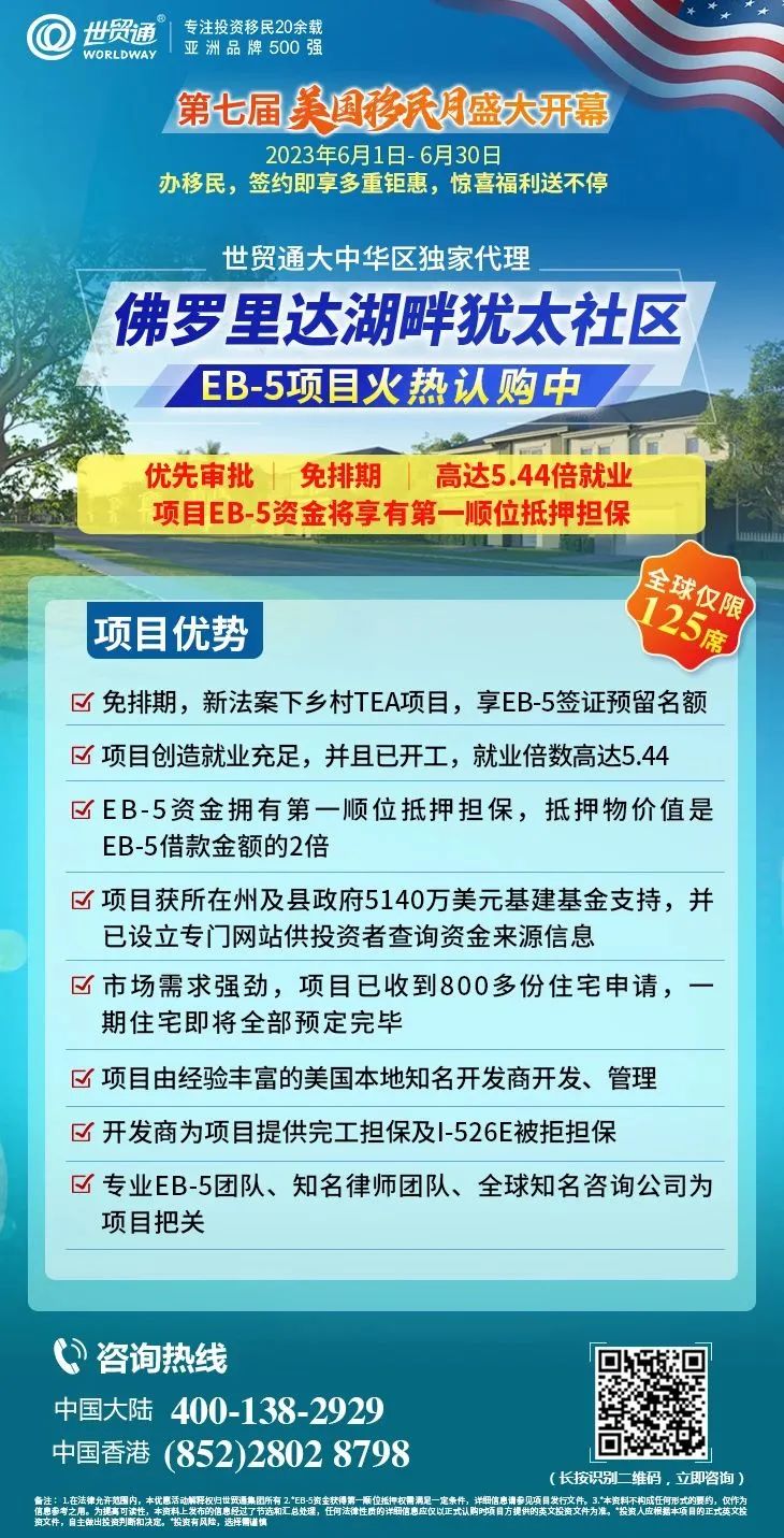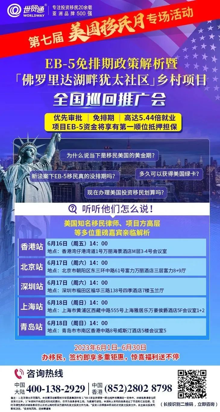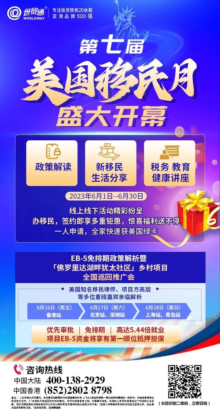2023年6月,中国迎来第七届美国移民月,在欢庆第七届美国移民月的同时,世贸通将开展一些列线上线下活动,涵盖政策解读,新移民生活分享,税务、教育、健康讲座等众多主题,助力投资人抢抓2023年免排期移民美国的黄金机会。并且,在第七届美国移民月期间,世贸通推出重磅优惠,办移民,签约即享多重钜惠,惊喜福利送不停!机会千载难逢,优惠名额有限,早行动早受益。