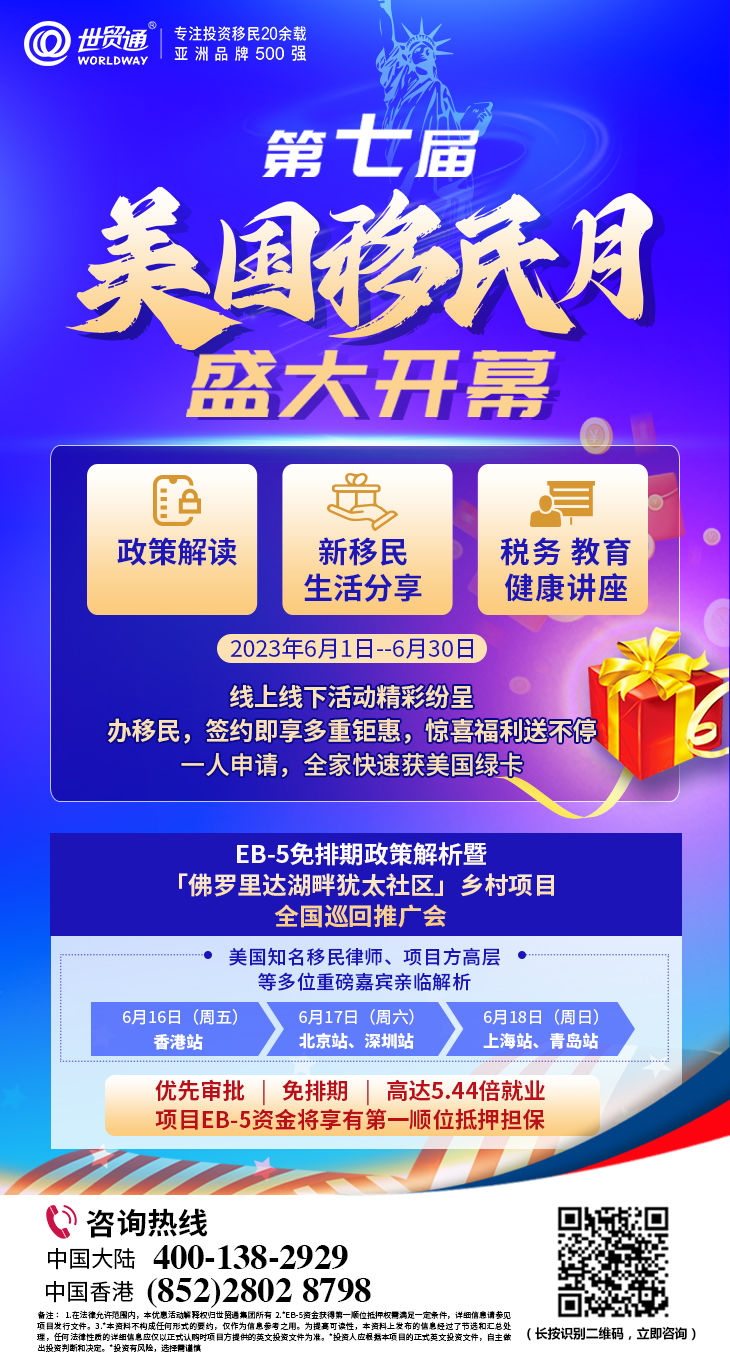 2023年6月,中国迎来第七届美国移民月,在欢庆第七届美国移民月的同时,世贸通将开展一些列线上线下活动,涵盖政策解读,新移民生活分享,税务、教育、健康讲座等众多主题,助力投资人抢抓2023年免排期移民美国的黄金机会。并且,在第七届美国移民月期间,世贸通推出重磅优惠,办移民,签约即享多重钜惠,惊喜福利送不停!优惠名额有限,早行动早受益。