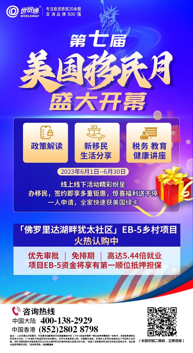 备注∶ 1.在法律允许范围内,本优惠活动解释权归世贸通集团所有 2.*EB-5资金获得第一顺位抵押权需满足一定条件,详细信息请参见项目发行文件。3.*本资料不构成任何形式的要约,仅作为信息参考之用。为提高可读性,本资料上发布的信息经过了节选和汇总处理,任何法律性质的详细信息应仅以正式认购时项目方提供的英文投资文件为准。*投资人应根据本项目的正式英文投资文件,自主做出投资判断和决定。*投资有风险,选择需谨慎
