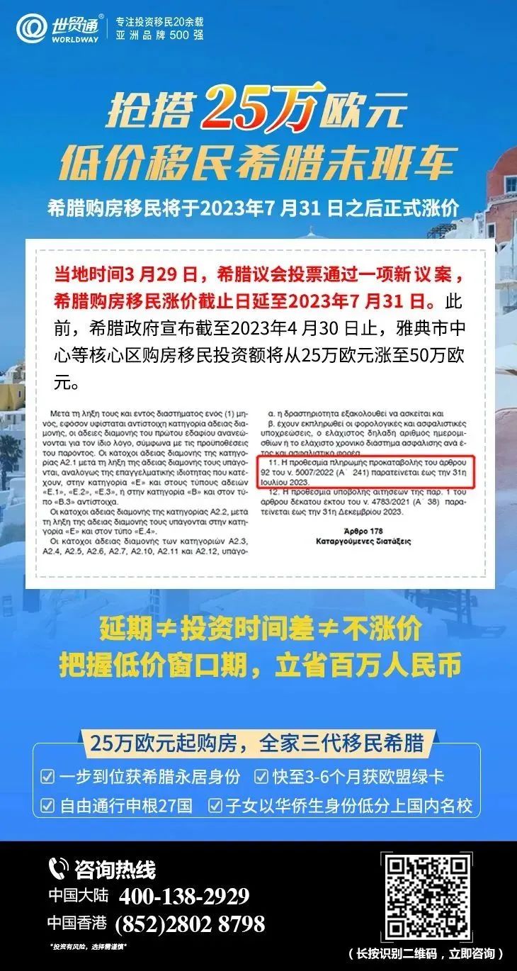 由此可见,全球申请人都想把握最后的低价拿身份机会,赶搭25万欧元低价移民希腊末班车。2023年7月31日之后,希腊购房移民热门投资区域投资门槛将从25万欧元涨至50万欧元!目前距离涨价仅剩19天,抢搭最后一趟低价移民希腊末班车的时间已经不多了,对于有意向移民希腊的投资者,赶紧锁定政策,抓紧上车吧。