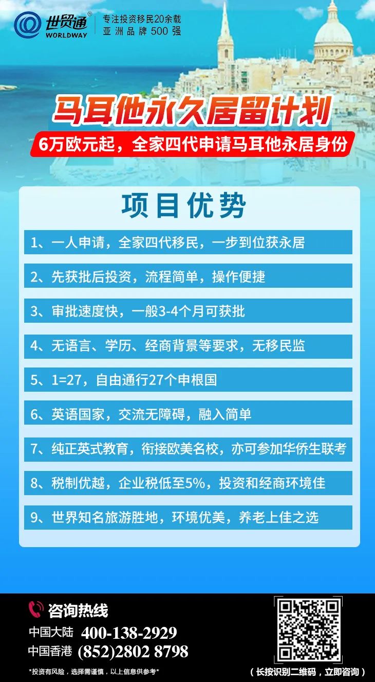 今年以来,欧洲各国移民计划相继变政,通往欧洲的大门是越来越窄了。对于想要移民欧洲的投资者而言,现在正是办理马耳他移民的好时机,申请人仅需投资6万欧元起,可全家四代移民马耳他,一步到位获马耳他永居身份!此项目没有语言、学历、经商背景、资金来源等要求,申请条件更加简化、操作更加简单、投资金额更低!