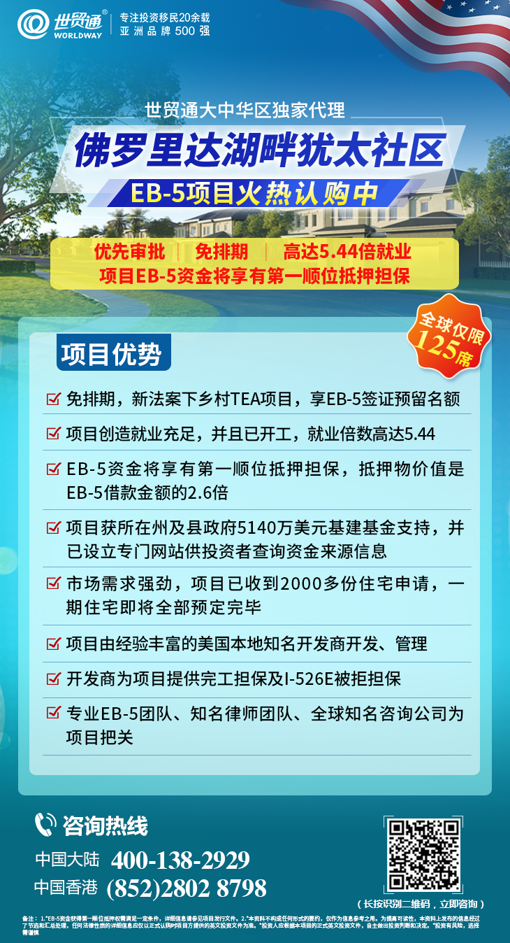 目前,市面上热门的「佛罗里达湖畔犹太社区」EB-5乡村项目,为中国投资者提供了快速获得美国绿卡的上佳机会!该项目是符合新法案下的乡村TEA项目,集免排期、项目就业倍数高达5.44、EB-5资金将享有第一顺位抵押担保等独特优势。并且,该项目得到美国政府5140万美元基建基金的支持,目前已设立专门的网站https://lakefrontestatescdd.org/,供投资者查询资金来源信息;项目市场需求强劲,一期住宅已经全部售罄。可遇不可求的优质乡村EB-5项目,经过一轮又一轮的抢购之后,所剩名额越来越少,好项目不等人,有意向者认购须从速!