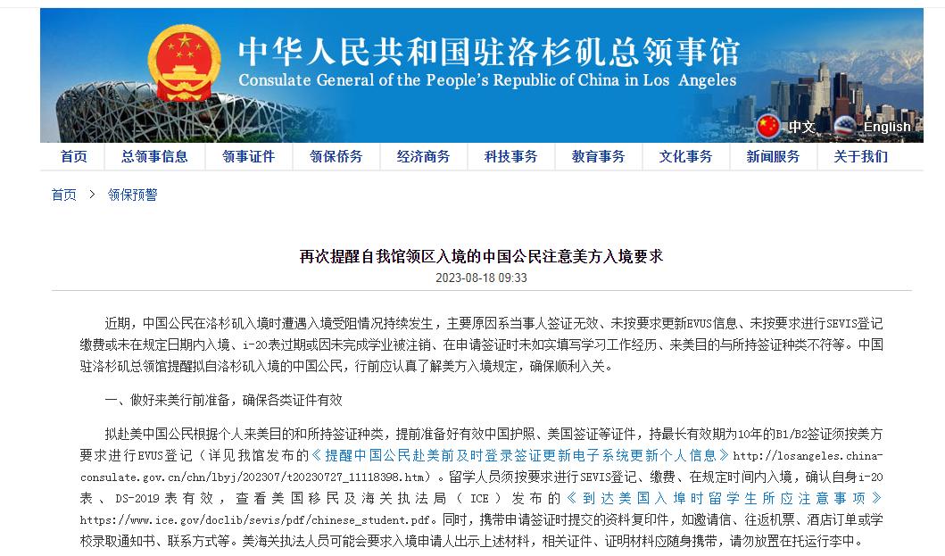 近期,中国公民在洛杉矶入境时遭遇入境受阻情况持续发生,主要原因系当事人签证无效、未按要求更新EVUS信息、未按要求进行SEVIS登记缴费或未在规定日期内入境、i-20表过期或因未完成学业被注销、在申请签证时未如实填写学习工作经历、来美目的与所持签证种类不符等。中国驻洛杉矶总领馆提醒拟自洛杉矶入境的中国公民,行前应认真了解美方入境规定,确保顺利入关。