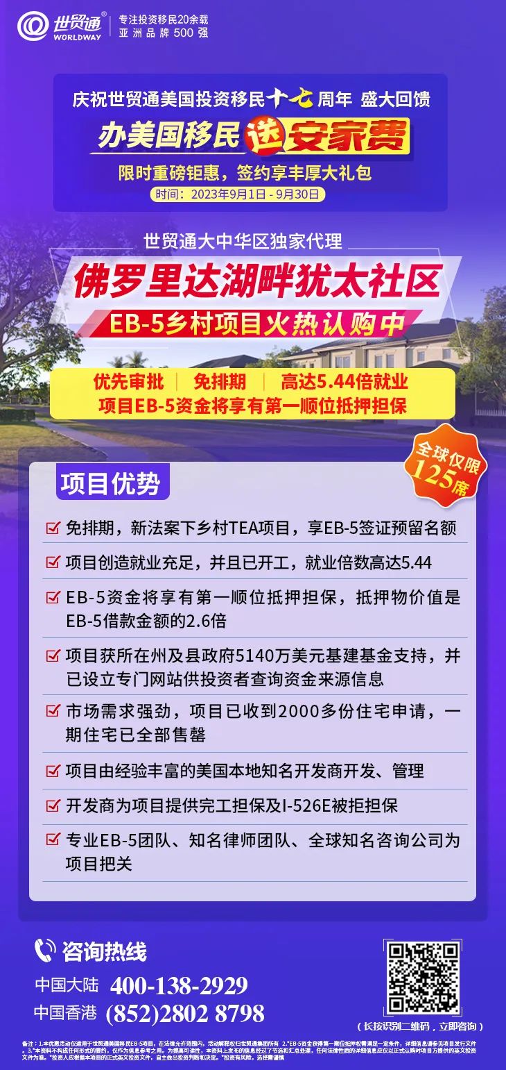 庆祝世贸通美国投资移民十七周年,盛大回馈活动火热进行中!把握EB-5移民新政大利好,抢抓快速移民美国的黄金期机会就是现在!更多详情,请在评论区私信我们,或拨打世贸通服务热线,中国大陆:400-138-2929 ,中国香港:(852)2802 8798。