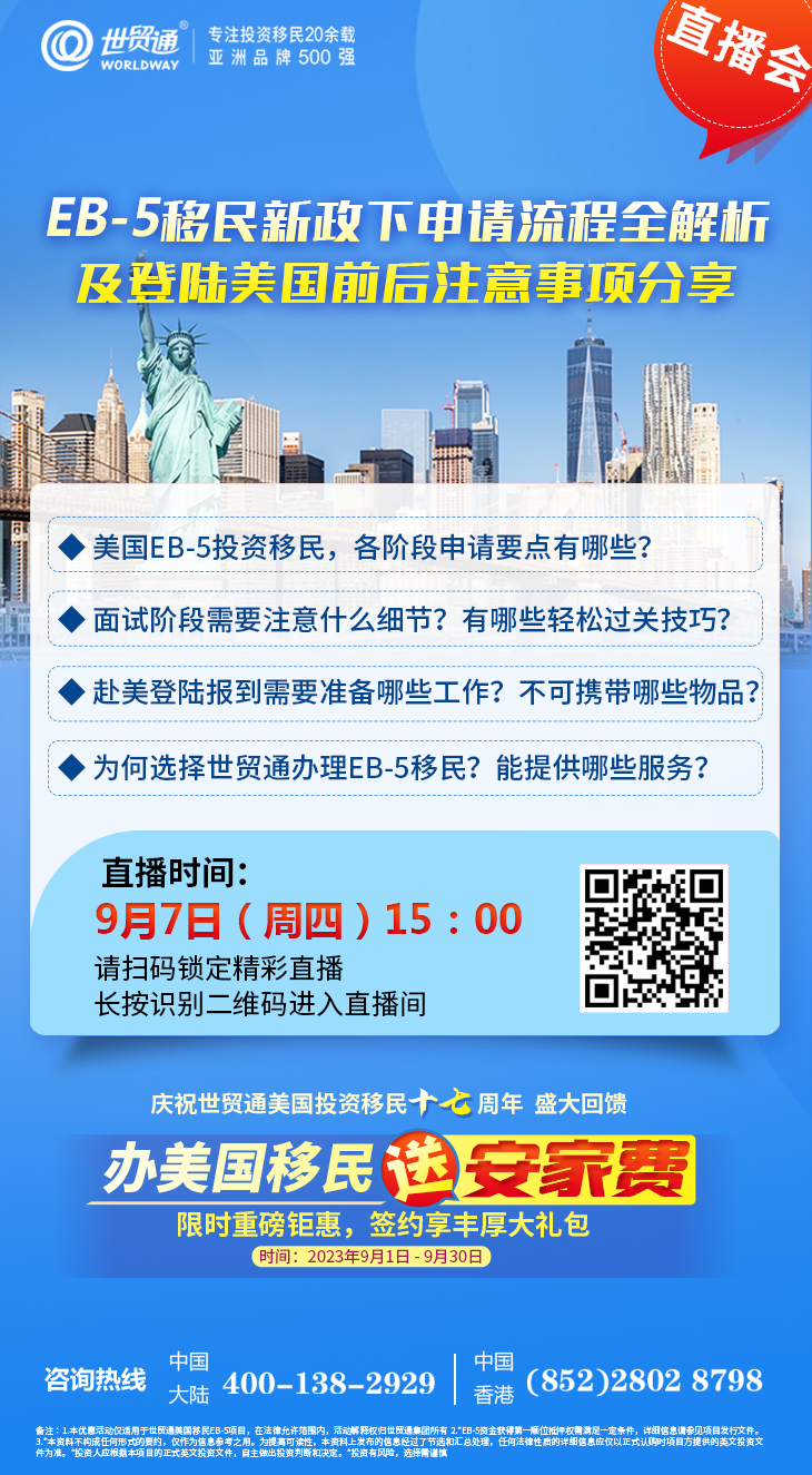 关于更多登陆美国的事项,以及EB-5移民新政下的申请流程及面试环节等等,欢迎关注世贸通直播间,2023年9月7日(周四)15:00,世贸通资深移民专家将在线为您全面解析EB-5移民新政下申请流程及分享登陆美国的注意事项!