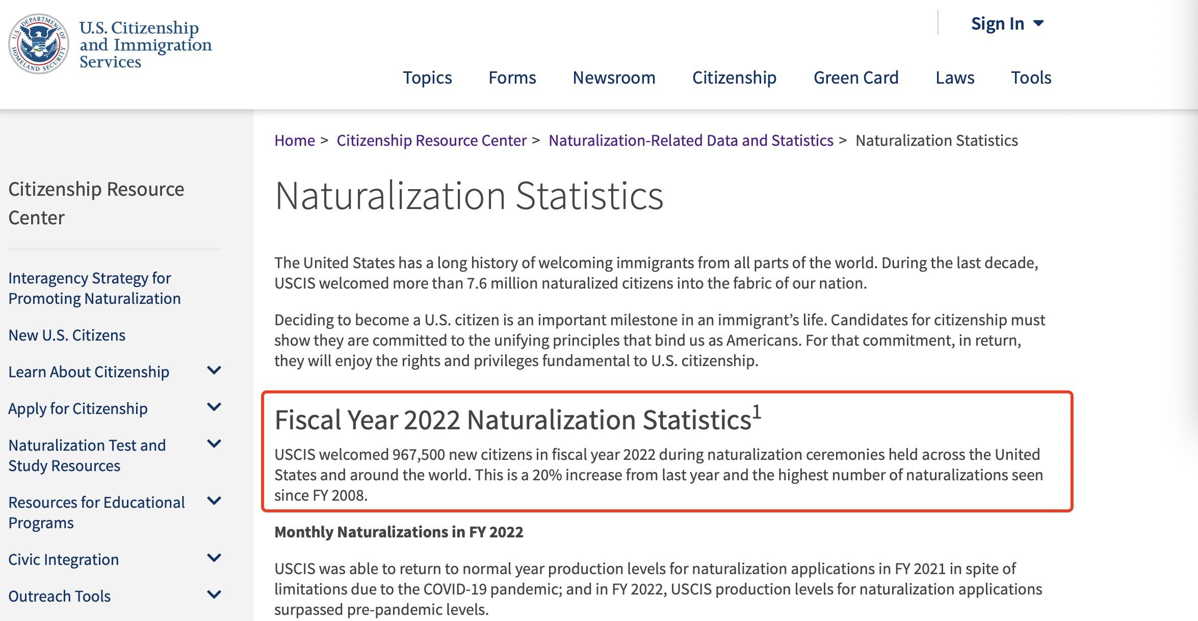 前不久,美国移民局(USCIS)更新了2022财年的移民数据。2022财年美国迎来了967,500名新公民。比上一财年增加了20%,这也创造了近15年来入籍美国人数的历史新高。在过去10年中,共有760多万人成为新公民。