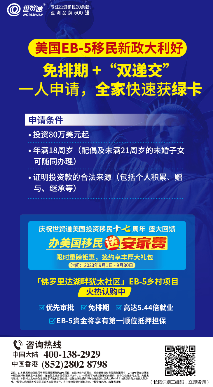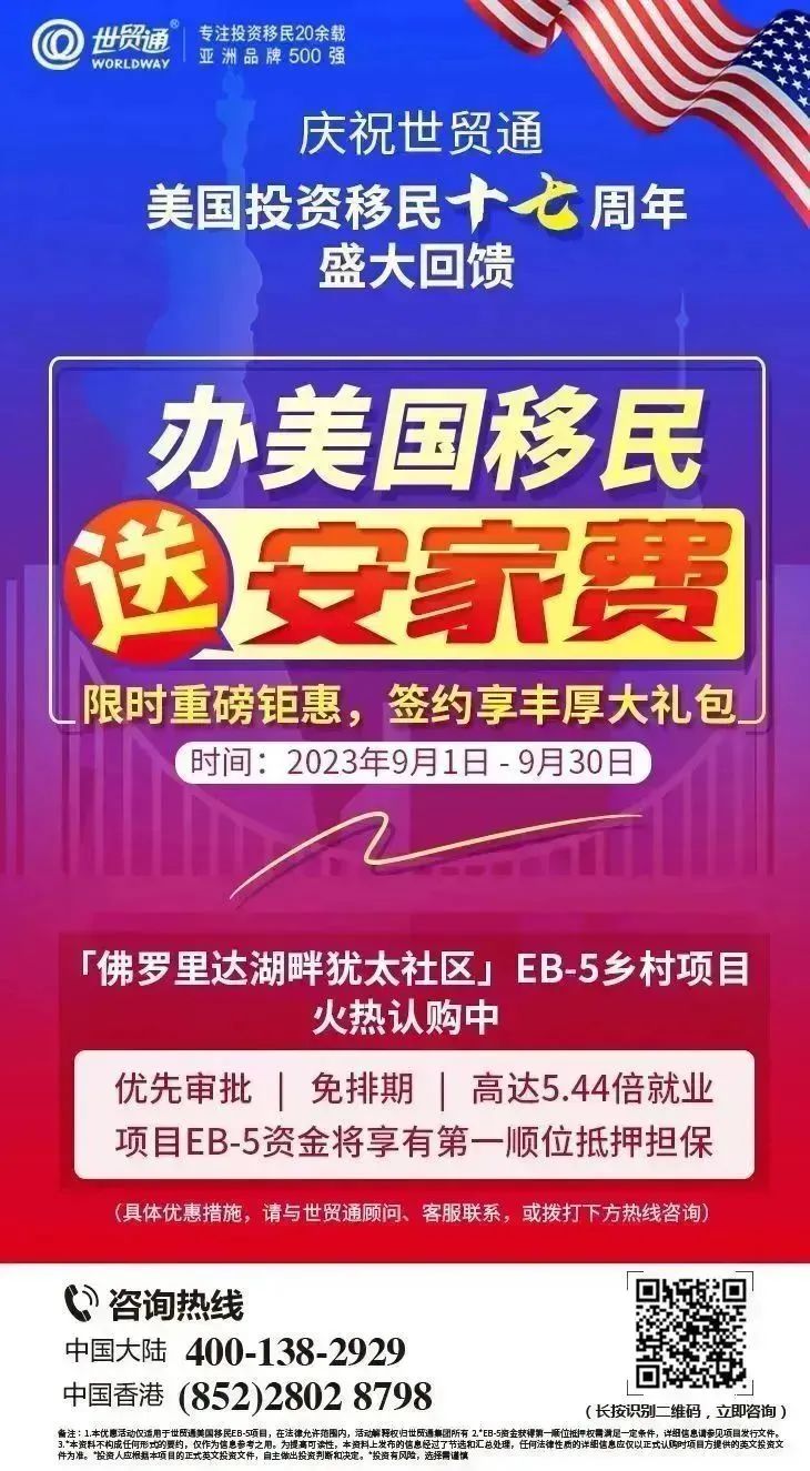 庆祝世贸通美国投资移民十七周年,盛大回馈活动火热进行中!把握EB-5移民新政大利好,抢抓快速移民美国的黄金期机会就是现在!更多详情,请在评论区私信我们,或拨打世贸通服务热线,中国大陆:400-138-2929 ,中国香港:(852)2802 8798。