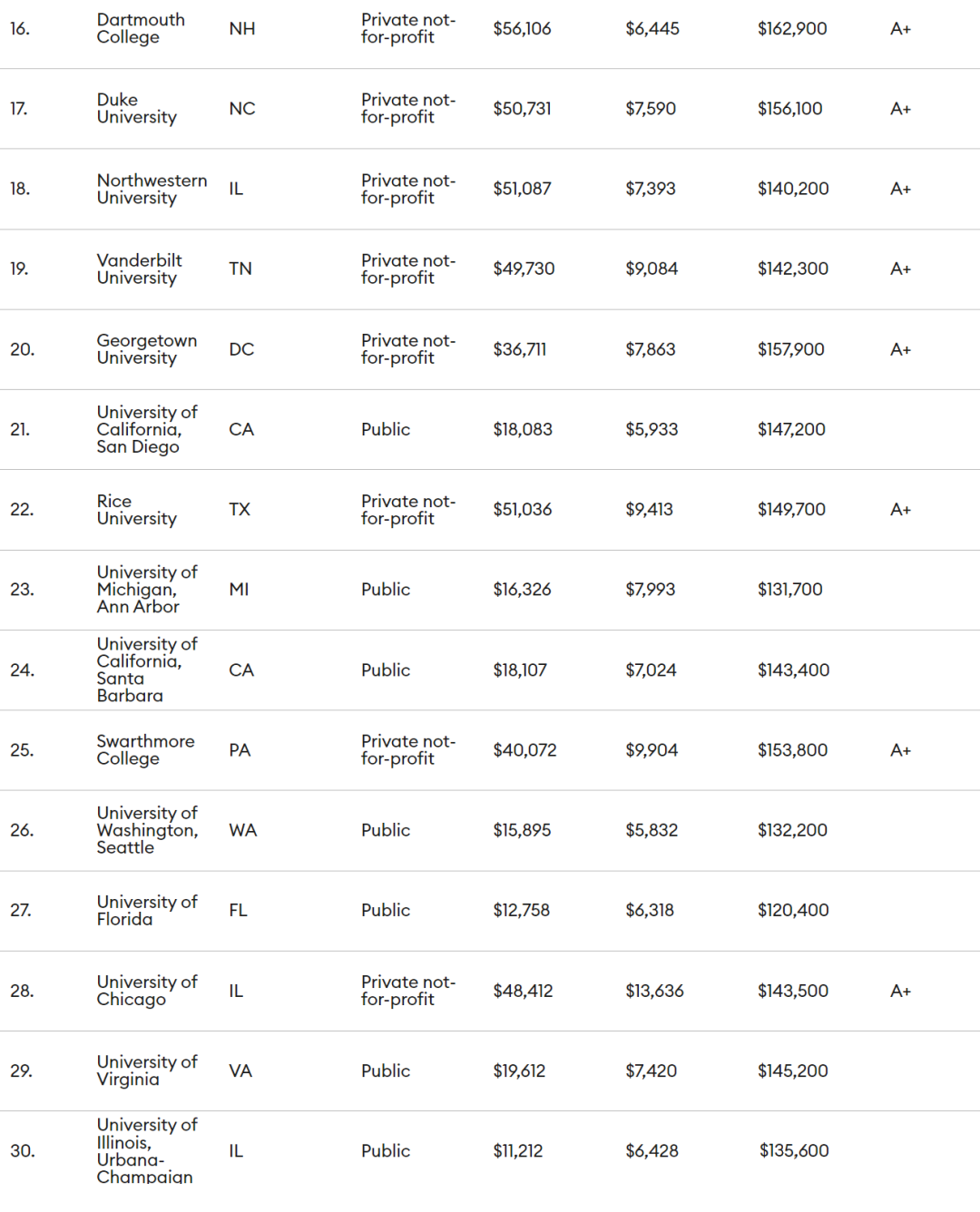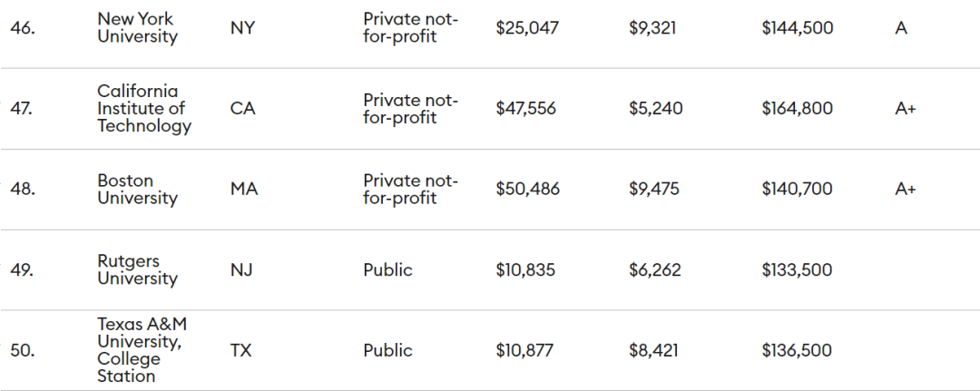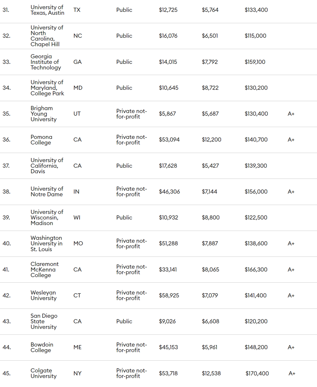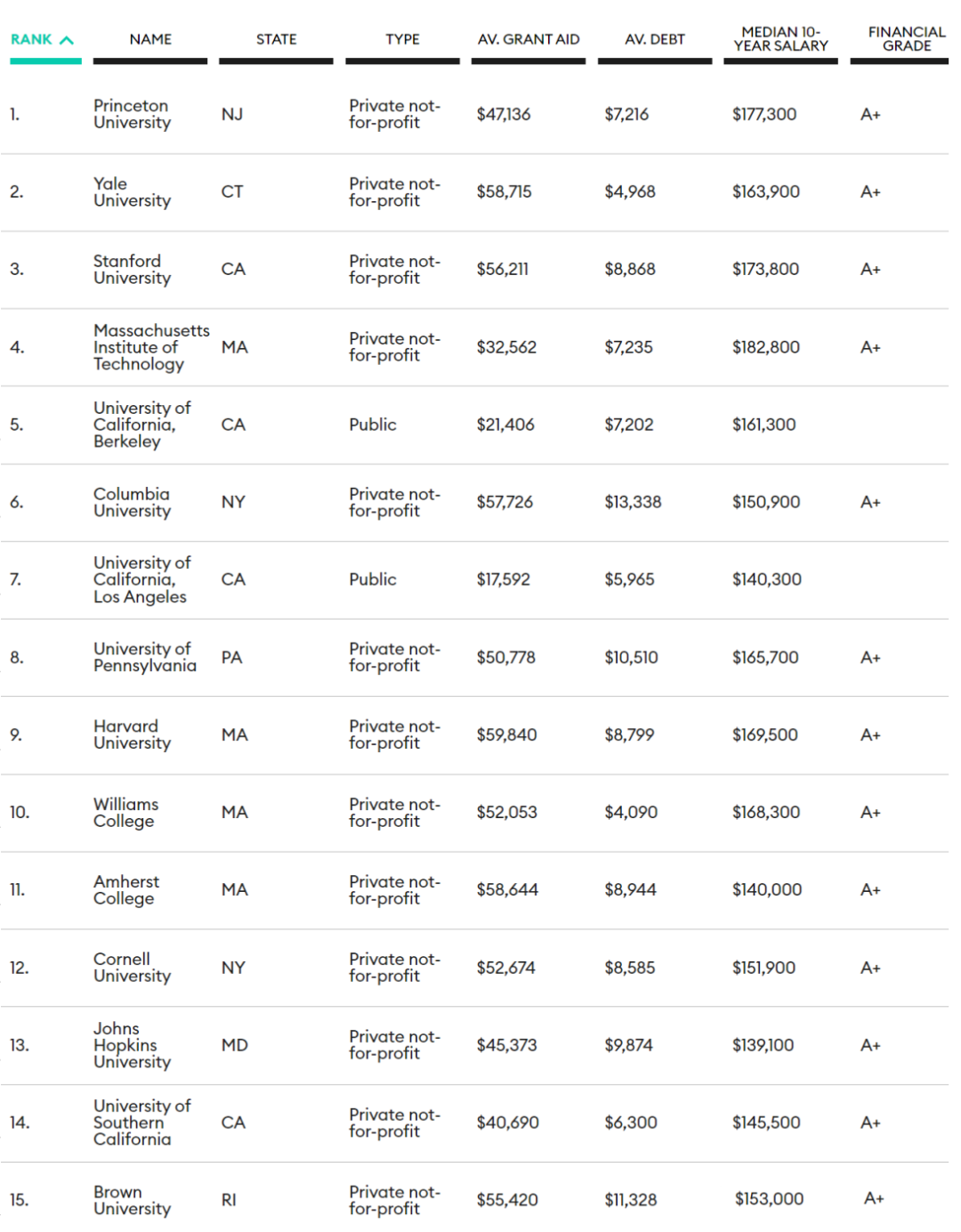 福布斯榜单更为注重学生成就,而不是学校声誉和入学考试成绩,参考指标权重:校友薪资 (20%)、学生债务 (15%)、毕业率 (15%)、福布斯美国领袖榜(15%)、投资回报率 (15%)、保留率(10%)、学业成功率(10%)。