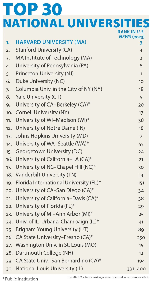 《华盛顿月刊》(Washington Monthly)成立于1969年,总部位于华盛顿特区的非营利政治杂志。该月刊自2005年起每年发布一份大学排名。综合性大学TOP30: