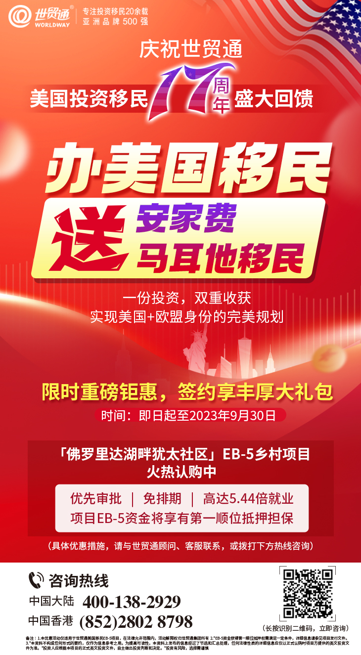 庆祝世贸通美国投资移民十七周年,盛大回馈活动重磅升级,办美国移民,送安家费,另送马耳他移民,即日起至2023年9月30日,限时重磅钜惠,签约享丰厚大礼包!