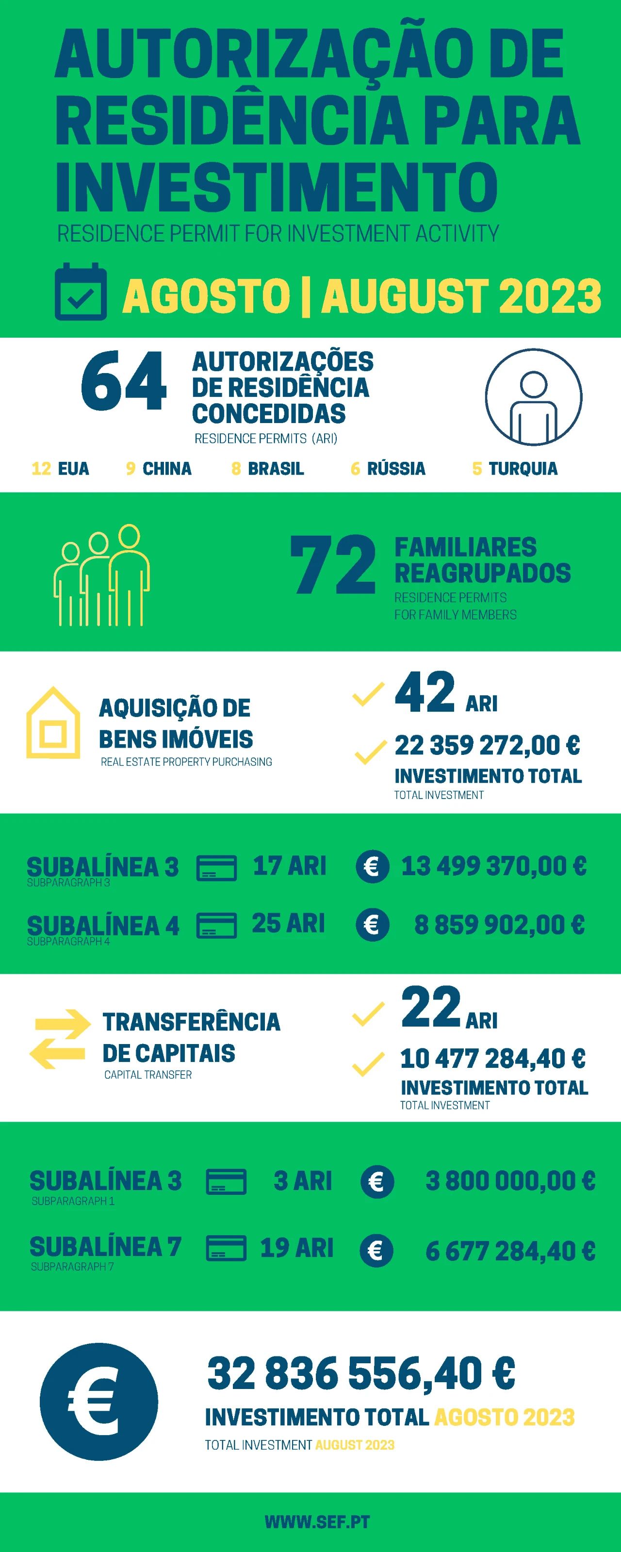 近日,葡萄牙移民局(SEF)公布了2023年8月份的黄金签证数据。2023年8月份,共计有64位主申请人和72位附属申请获批葡萄牙黄金签证,投资额为3283万欧元。其中,来自美国的主申请人12人,排名位列首位,其次是中国(9人)、巴西(8人)、俄罗斯(6人)和土耳其(5人)。