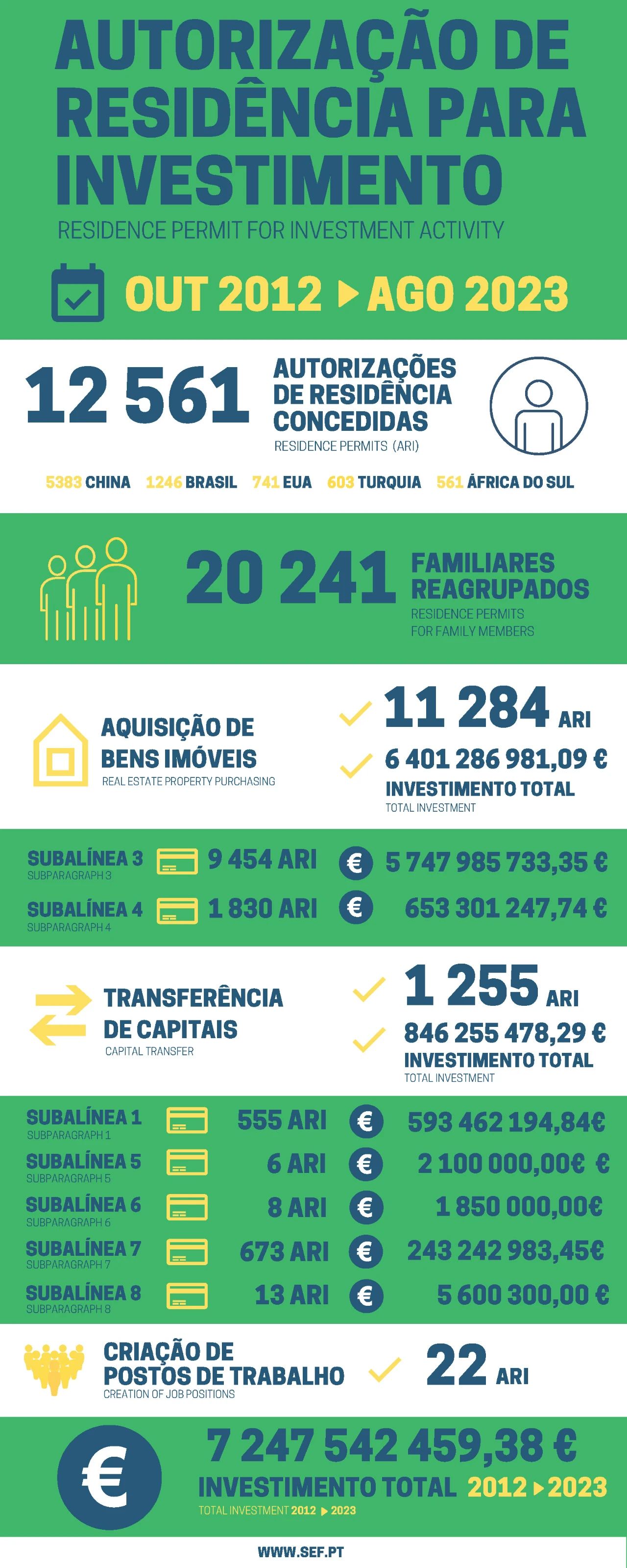 此外,葡萄牙移民局也再次更新了2012年10月黄金居留政策推行以来的整体数据,数据显示,截止今年8月底,已有12561位主申请人获批葡萄牙黄金签证,获批附属申请人20241位。其中,中国家庭的获批数量还是稳居第一,高达5383组,占比在43%,可见中国投资者对葡萄牙移民项目的喜爱和认可。并且,通过黄金居留计划,葡萄牙共吸纳了72.47亿欧元投资,其中64.01亿资金直接投资于房地产市场,可见房产投资仍然是主要投资方式。