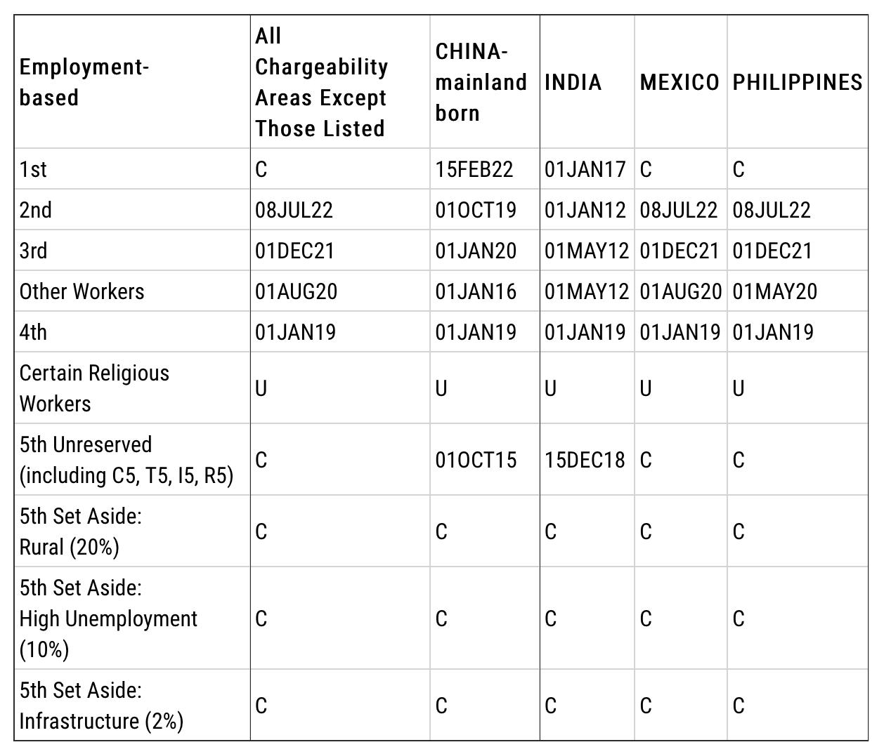 B表:Dates For Filing Of Employment-Based Visa Applications