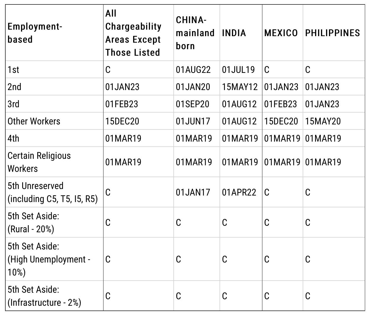 A表:Final Action Dates For Employment-Based Preference Cases