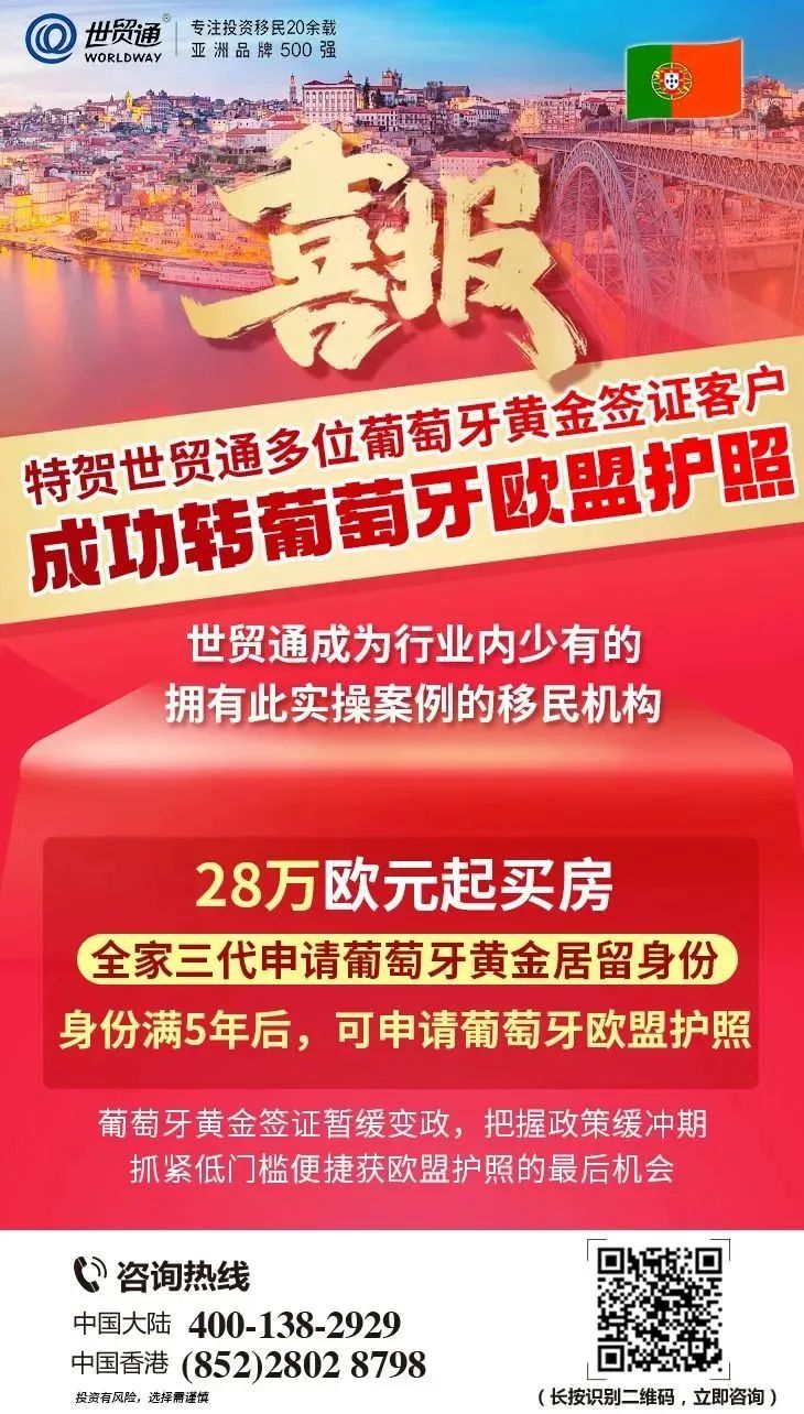重大喜讯。近日,世贸通葡萄牙移民项目迎来重磅喜讯!世贸通多位葡萄牙黄金签证客户陆续成功获得葡萄牙护照,即欧盟护照。在此,世贸通集团向投资人表示衷心祝贺。