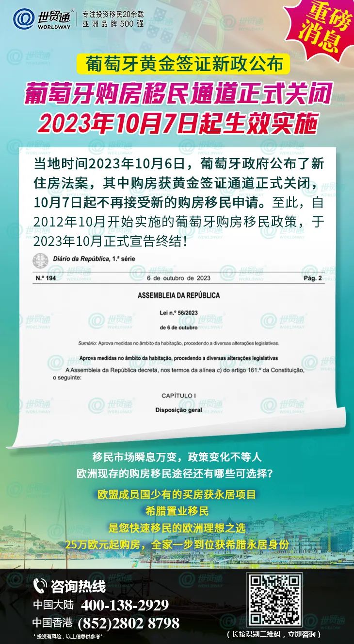 当地时间2023年10月6日,葡萄牙共和国日报刊发了新住房法案,于次日生效,即10月7日正式实施!其中葡萄牙投资移民中购房移民彻底结束,10月7日起不再接受新的购房移民申请。