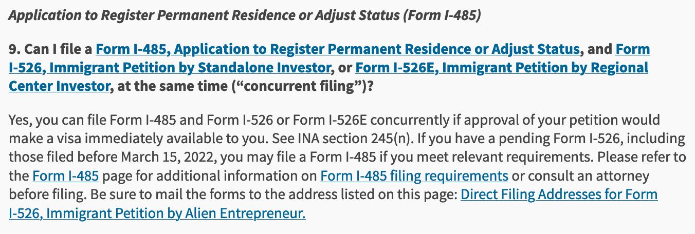 近日,美国投资移民利好消息频频传来,美国移民局首次明确了新法案前递交I-526申请的老投资人也可以双递交,也就是老投资人在I-526获批之前,如果表A还没排到,但表B已经排到的情况下(且在表B开放的前提下),该投资人若以其它合法身份在美国境内,即可递交I-485调整身份及工签和旅行签的申请。若该投资者表A已经排到,则与新法案后的免排期的投资者无异,可直接递交I-485。