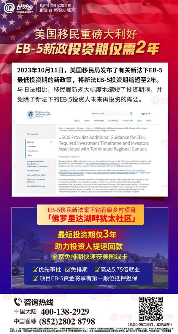 目前,市面上热门的「佛罗里达湖畔犹太社区」EB-5项目,最短投资期限3年,是符合新法案下的乡村TEA项目,集免排期、移民局优先审理、项目就业倍数高达5.75、EB-5资金将享有第一顺位抵押担保等诸多优势于一身,是助力投资人快速移民美国的优选!
