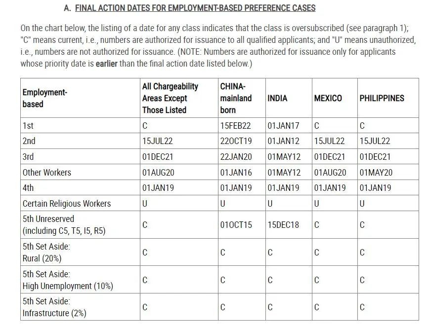 A表:Final Action Dates For Employment-Based Preference Cases