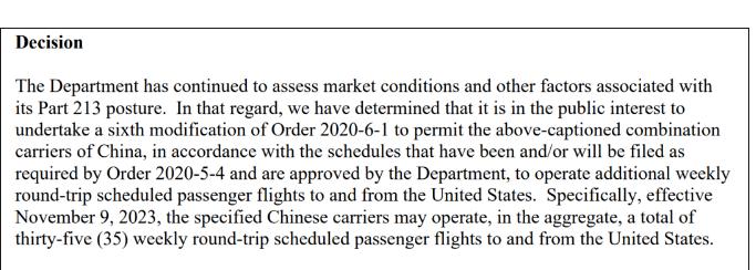 根据双方对等原则,所以35班也同样适用于中国航司,即2023/2024冬春航季,有望从目前每周48班增至每周70班,双方航空公司每周各运营35班。