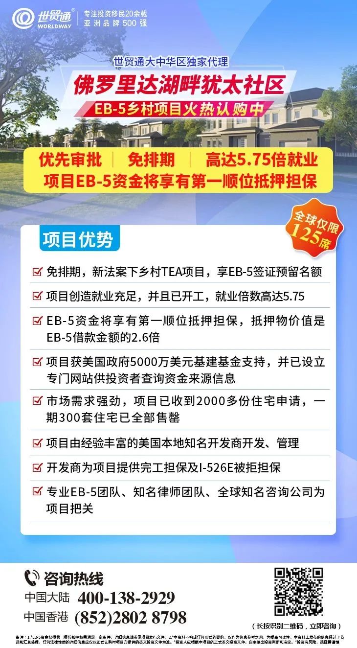 此外,由世贸通担任大中华区独家代理的「佛罗里达湖畔犹太社区」EB-5项目,同样是投资者快速移民美国的不错之选。该项目最短投资期仅3年,且是符合新法案下的乡村TEA项目,集免排期、移民局优先审理、项目就业倍数高达5.75、EB-5资金将享有第一顺位抵押担保等诸多优势于一身,为投资者提供了快速获得美国绿卡的上佳机会!可遇不可求的优质乡村EB-5项目,经过一轮又一轮的抢购之后,所剩名额越来越少,好项目不等人,有意向者认购须从速!