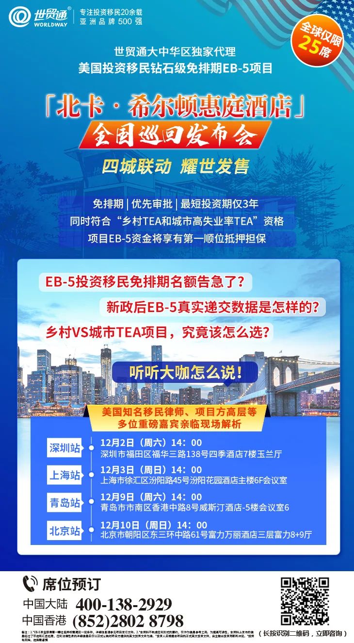 此外,由世贸通担任大中华区独家代理的,美国投资移民又一钻石级EB-5项目「北卡·希尔顿惠庭酒店」,同样投资者快速移民美国的优选。该项目同时符合“乡村TEA”和“城市高失业率TEA”资格,具有优先审批、免排期、价值 2.9 倍不动产抵押担保/开发商个人资产担保、EB-5资金与桃树基金的资金同享第一顺位抵押担保、大学城不可复制稀缺地段、最短投资期仅3年等多重优势,项目全球仅限25席,名额不多,有意向者认购需从速!
