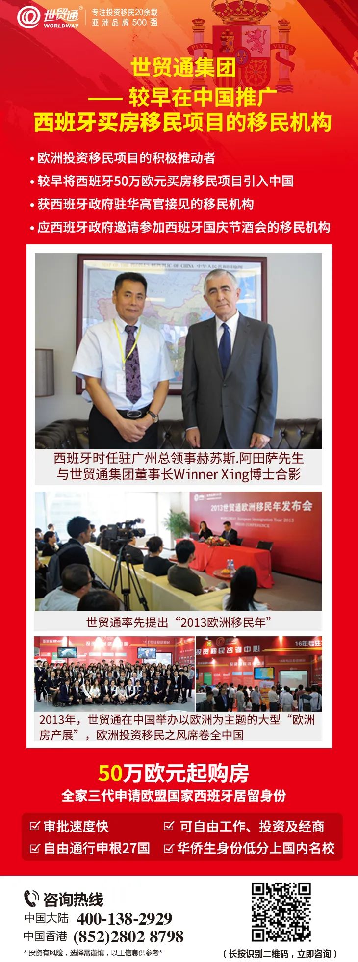 作为亚洲品牌500强和专注投资移民20余载的世贸通集团,是在中国较早推广西班牙买房移民项目的移民机构,也是较早将西班牙50万欧元买房移民项目引入中国的机构,助力众多投资者圆梦西班牙。世贸通集团,是您办理西班牙移民的放心之选。