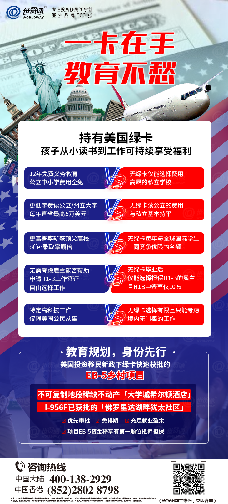 由世贸通集团担任大中华区独家代理的「大学城希尔顿酒店」EB-5乡村项目,具有优先审批、免排期、价值2.9倍不动产抵押担保50%/开发商个人资产担保50%、EB-5资金与桃树集团同进同出,永享第一顺位抵押担保、大学城不可复制稀缺地段、最短投资期仅3年、同时符合“乡村TEA”和“城市高失业率TEA”资格等多重优势,项目全球仅限25席,名额不多,有意向者认购需从速!