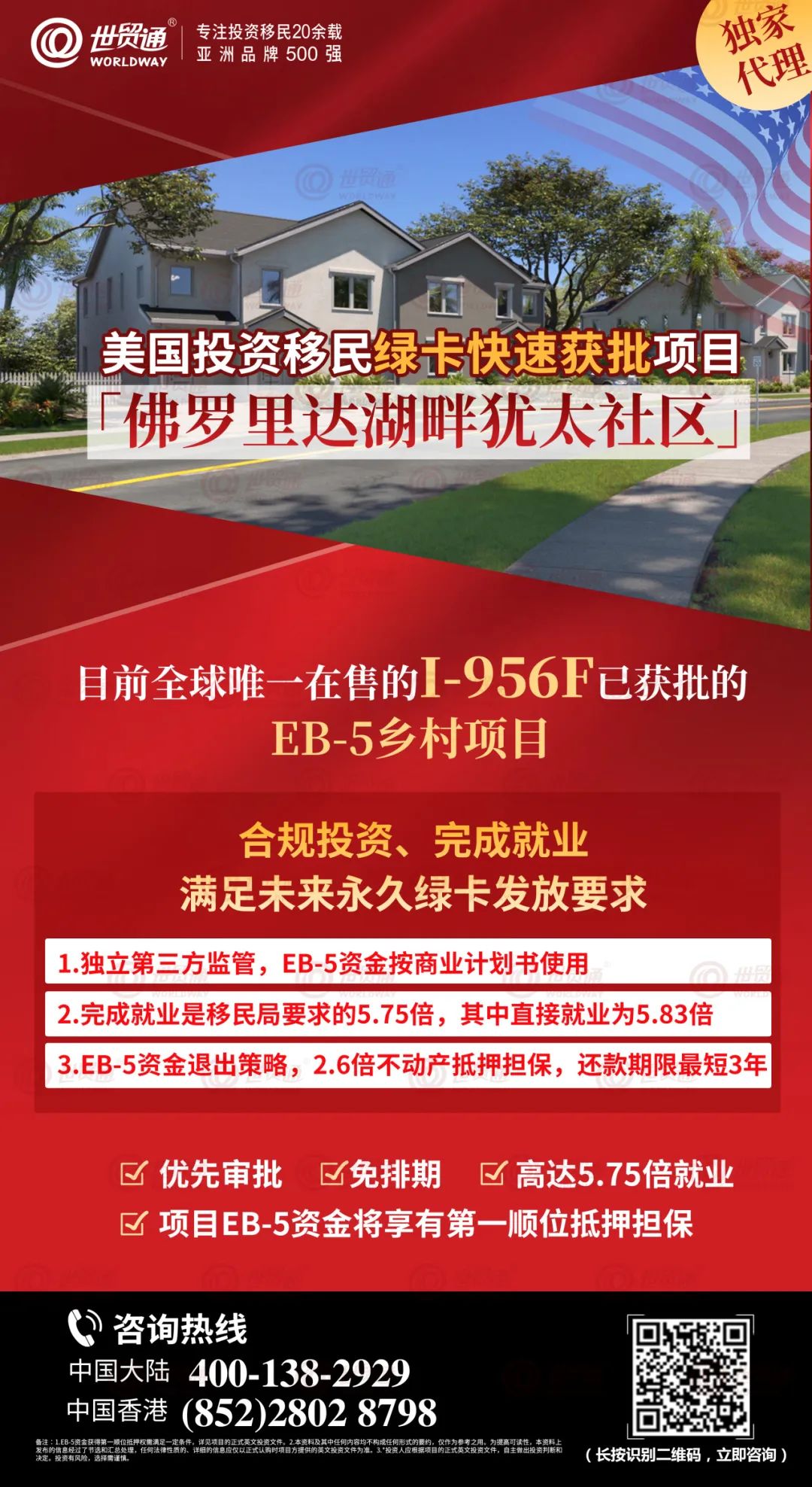 对于EB-5投资者而言,选择就业创造系数高的项目,是获得永久绿卡保障的有力信号。「佛罗里达湖畔犹太社区」EB-5乡村项目优势多多,是投资者快速移民美国的不错之选。该项目集免排期、优先审理、项目就业倍数高达5.75、EB-5资金将享有第一顺位抵押担保、最短投资期仅3年等诸多优势于一身,为投资者提供了快速获得美国绿卡的上佳机会!可遇不可求的优质乡村EB-5项目,经过一轮又一轮的抢购之后,全球仅剩少量名额,好项目不等人,有意向者认购须从速!