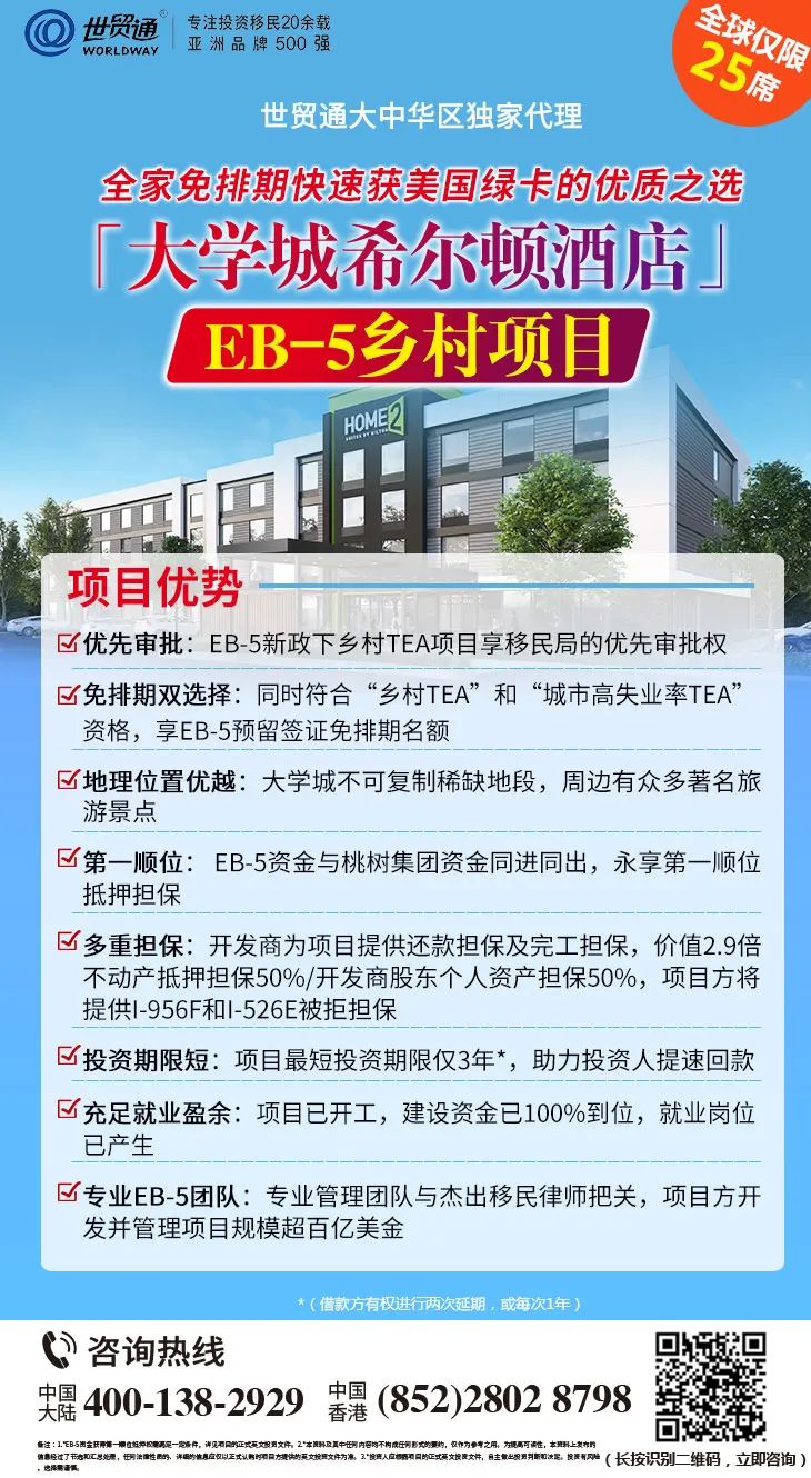 目前,由世贸通担任大中华区独家代理的,北卡罗来纳州大学城稀缺不动产「大学城希尔顿酒店」EB-5乡村项目,是投资者全家快速获美国绿卡的优质之选。此项目具有优先审批、免排期、价值2.9倍不动产抵押担保50%/开发商股东个人资产担保50%、EB-5资金与桃树集团同进同出,永享第一顺位抵押担保等多重优势,全球仅限25席,名额珍稀,有意向者认购需从速!