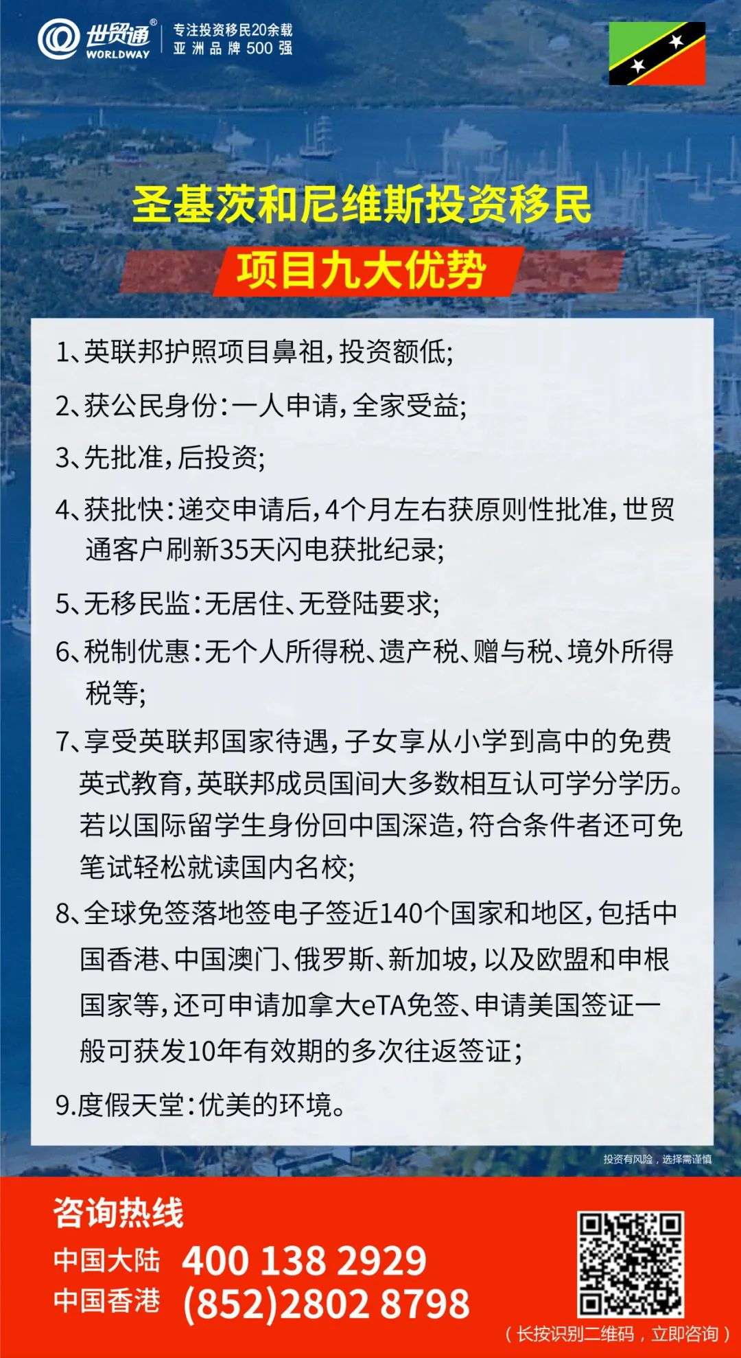位于加勒比海地区的圣基茨和尼维斯,素有“北美后花园”、“加勒比海明珠”之美誉,是全球知名旅游胜地,亦是全球富豪们向往的移民胜地。圣基茨作为全球较早开展投资移民的国家,圣基茨投资入籍项目自1984年开始,截止目前已经运行40年,被誉为移投行业的“铂金标准”,以其高效且健全的流程而闻名。此项目凭借其移民门槛简单、审批速度快等诸多优势,深受全球高净值人士青睐!