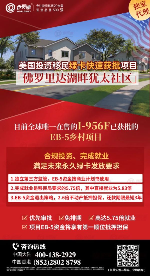 由世贸通担任大中华区独家代理的「佛罗里达湖畔犹太社区」EB-5乡村项目,自推出以来就备受关注,在EB-5市场上掀起数轮认购热潮,成为投资者快速移民美国的热门之选。同时,此项目还是目前全球唯一在售的I-956F已获批的EB-5乡村项目,移民局在审核该项目投资人的I-526E时,只需要审核投资人的个人文件即可,优势多多。
