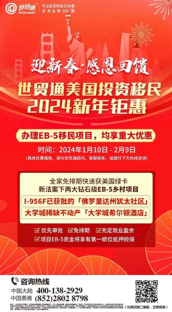 如果您想了解美国EB-5投资移民新政下的最新政策;如果您想了解EB-5项目的甄选方法;如果您正在考虑移民美国或正在为孩子留美做打算。世贸通一系列的赴美实地考察直播活动将陆续上演,欢迎您的关注。抓住2024年EB-5投资移民机会,精彩直播您千万不能错过!
