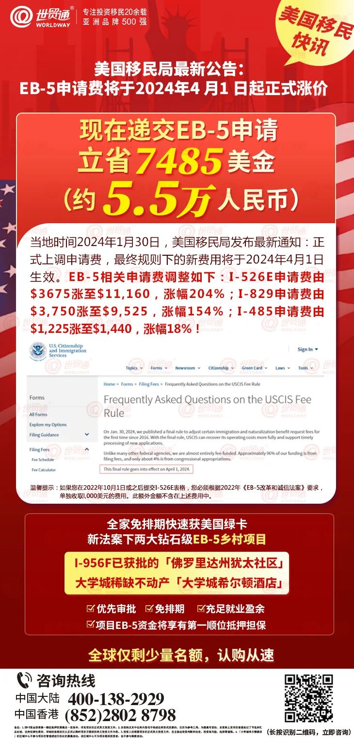 近日,美国移民局发布最新通知:正式上调申请费。EB-5相关申请费调整如下:I-526E申请费由$3675涨至$11,160,涨幅204% ;I-829申请费由$3,750涨至$9,525,涨幅154% ;I-485申请费由$1,225涨至$1,440,涨幅18%!这是移民局自2016年以来首次进行重大的费用调整。这项最终规定将于2024年4月1日生效!