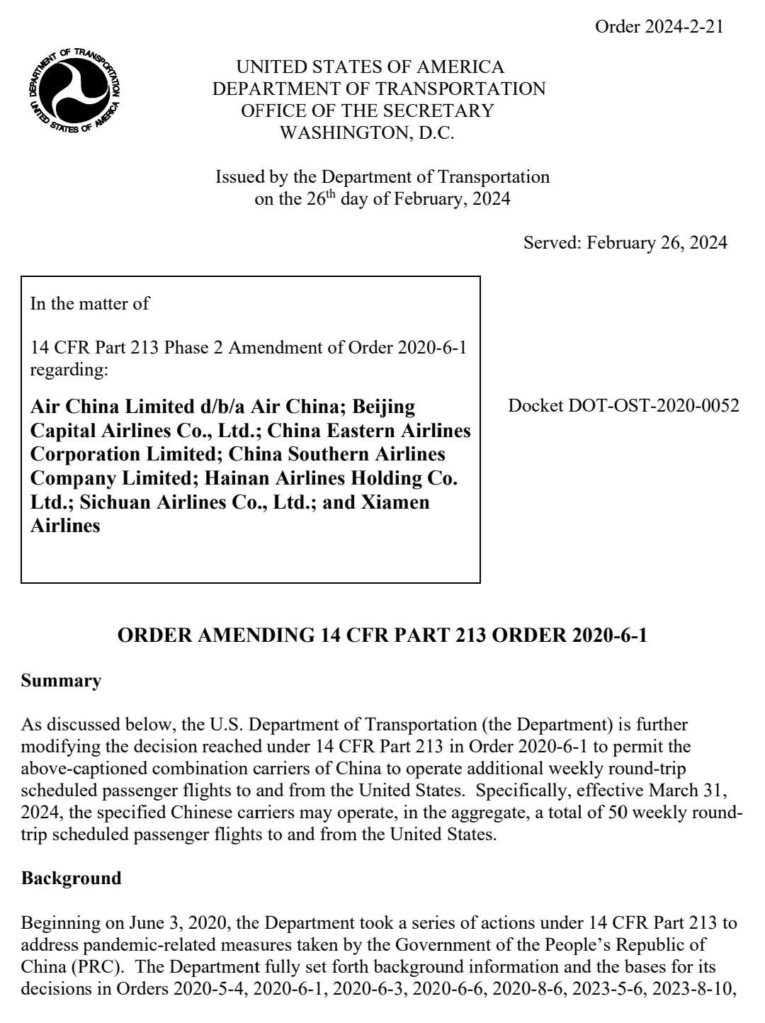 当地时间2月26日,美国交通部宣布,自2024年3月31日起,将允许中国航司执飞的中美往返航班数量从每周35个班次增加到每周50个班次。
