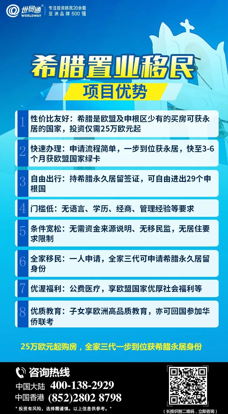 尽管目前细则尚未落地,但变政迫在眉睫!作为目前移民市场上少有的可以快速拿欧盟国家绿卡的项目,希腊购房移民是欧洲国家中性价比非常友好的移民项目,此项目申请条件宽松,无学历、无语言、无管理经验、无居住要求,并且可全家三代申请希腊永久居留签证,还可全家畅行29个申根国,同时还能享受希腊教育、医疗等社会福利待遇,并且满足条件后可申请欧盟护照,同时还能收获永久产权的房产,优势多多!