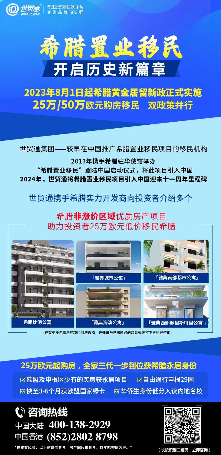 2013年7月,世贸通集团携手希腊驻华使馆举办“希腊置业移民”登陆中国启动仪式,将希腊置业移民项目引入中国。自此,古希腊文明之国,敞开了她容纳中国新移民的怀抱,这也标志着中国投资者正式拉开了在希腊建立“第二家园”的序幕!如今已是2024年,希腊置业移民登陆中国迎来十一周年的重大里程碑,意义非凡。(请点击相关阅读链接:重要里程碑!世贸通将希腊置业移民项目引入中国十周年)