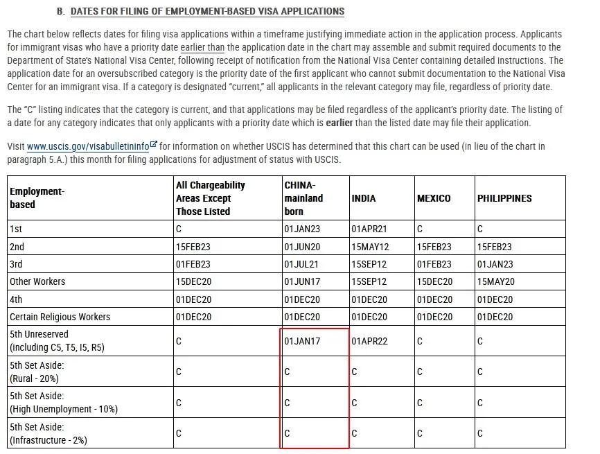 B表:Dates For Filing Of Employment-Based Visa Applications