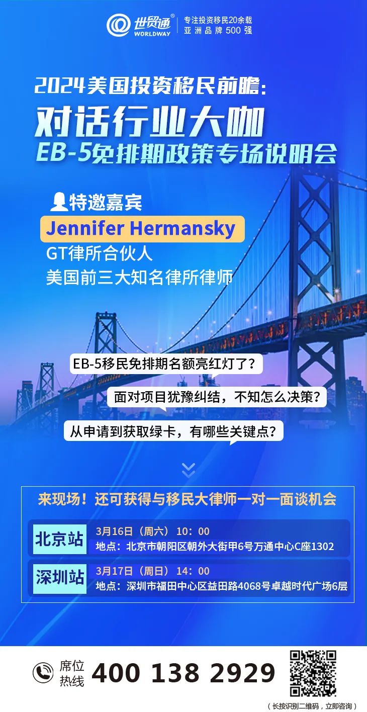 如果您想了解更多美国移民相关问题,欢迎来到现场与行业大咖进行面对面的交流。美国前三大知名律所律师——GT律所合伙人Jennifer Hermansky将为您提供专业的解答。名额有限,预约从速。