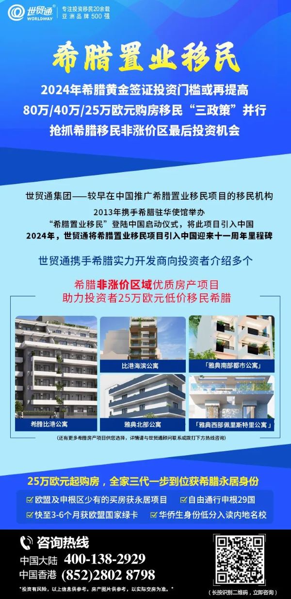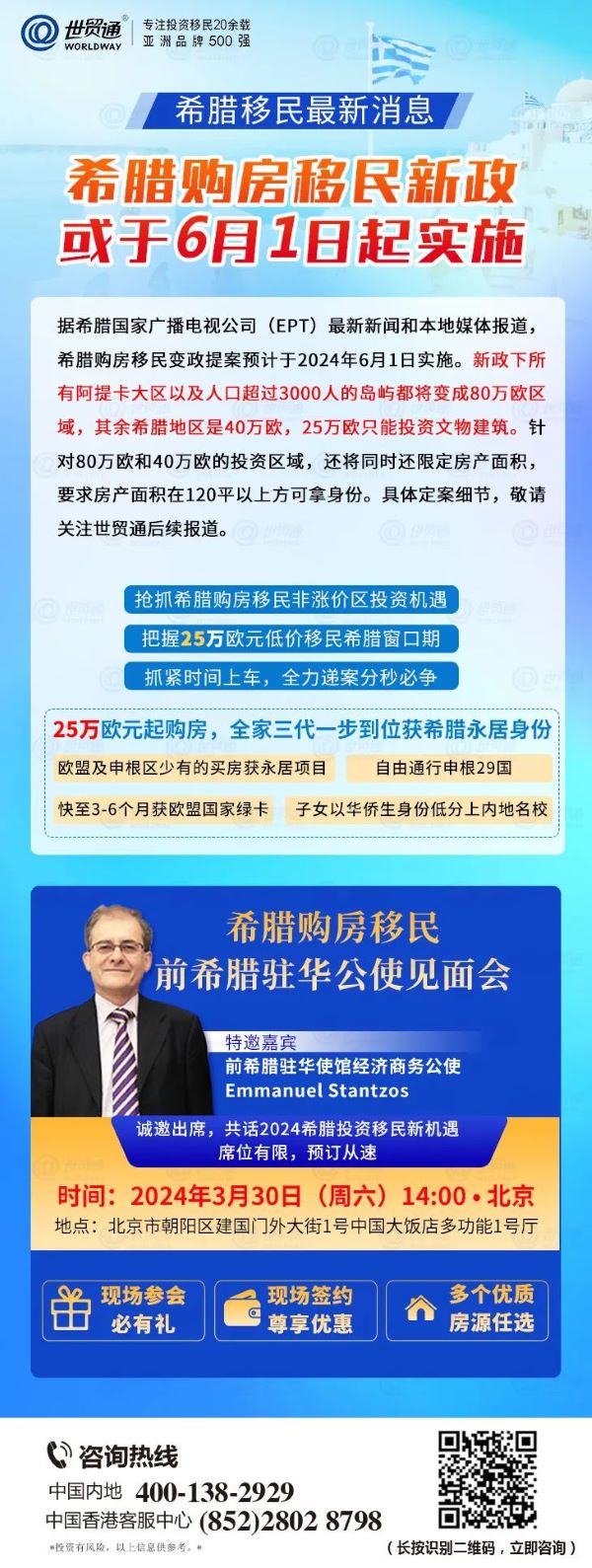 重大好消息!在希腊购房移民即将变政之际,世贸通特举行“希腊购房移民 - 前希腊驻华公使见面会”活动,我们特邀前希腊驻华使馆经济商务公使Emmanuel Stantzos先生出席,届时他将莅临现场为投资者分享希腊移民目前的政策趋势、投资机会,以及分享希腊的经济发展、历史文化等等,帮助投资者更全面的了解希腊,把握2024希腊投资移民新机遇。