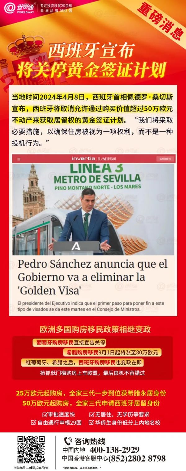 在此提醒,目前西班购房移民具体变政日期尚未确定,世贸通会密切保持关注。对于尚未决定的投资人,现在已经到了不得不抉择的时候!一次又一次的涨价、关停,不一例外地告诉我们,移民经不起等待,等着等着,价格涨了,项目停了,心仪的移民国家政策不允许了,后悔莫及,损失不仅仅是金钱,还有不可复制的良机。最后的机会已经到来,请抓紧时间。如需了解移民更多详细信息,请在评论区私信我们,或拨打世贸通服务热线,中国内地:400-138-2929 ,中国香港客服中心:(852)2802 8798