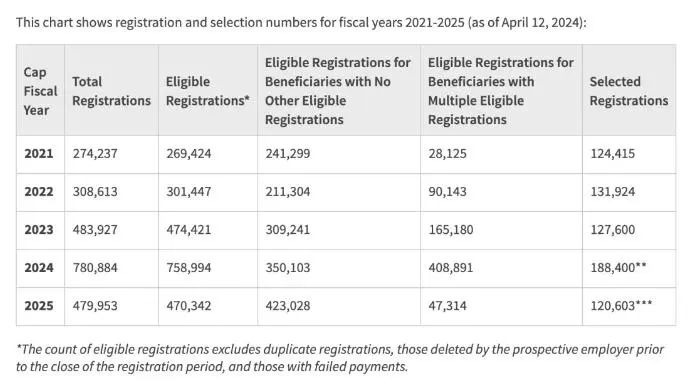 近日,美国移民局正式发布2025财年H-1B抽签完成通知。根据美国移民局公布信息,今年H-1B注册总数量为479,953份,其中有效注册数为470,342份,总中签数为120,603,中签率约为25.13%。