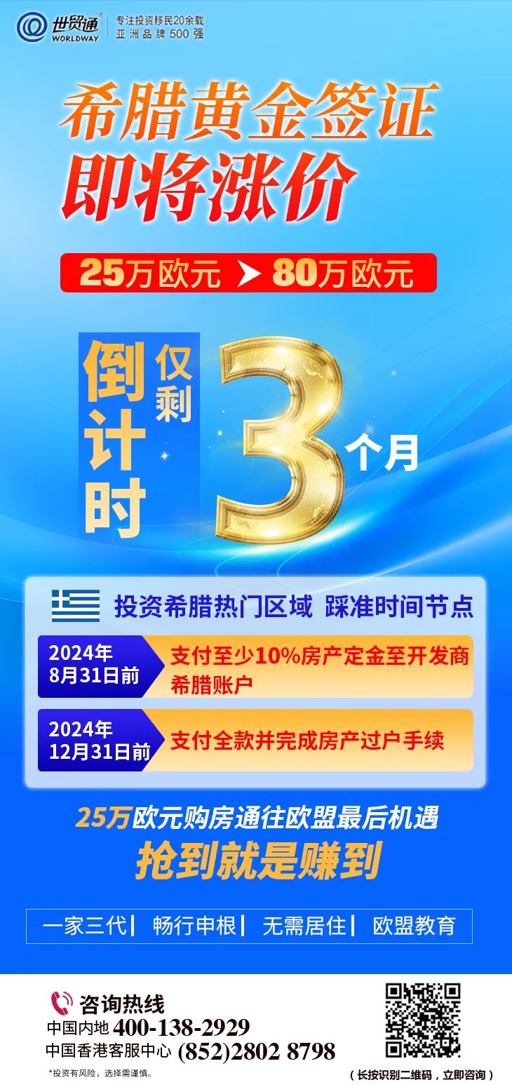 目前,移民希腊,投资者可选择在非涨价区购买25万欧元起的房产,可全家三代申请希腊永久居留签证。投资额相对亲民。但值得注意的是,2024年9月1日起,希腊黄金签证即将迈入80万欧元新时代。想要跟涨价新政赛跑的投资者,赶紧行动起来,政策窗口即将关闭!小投资大回报,且行且珍惜!赶搭高性价比欧盟绿卡未班车,切勿错过。
