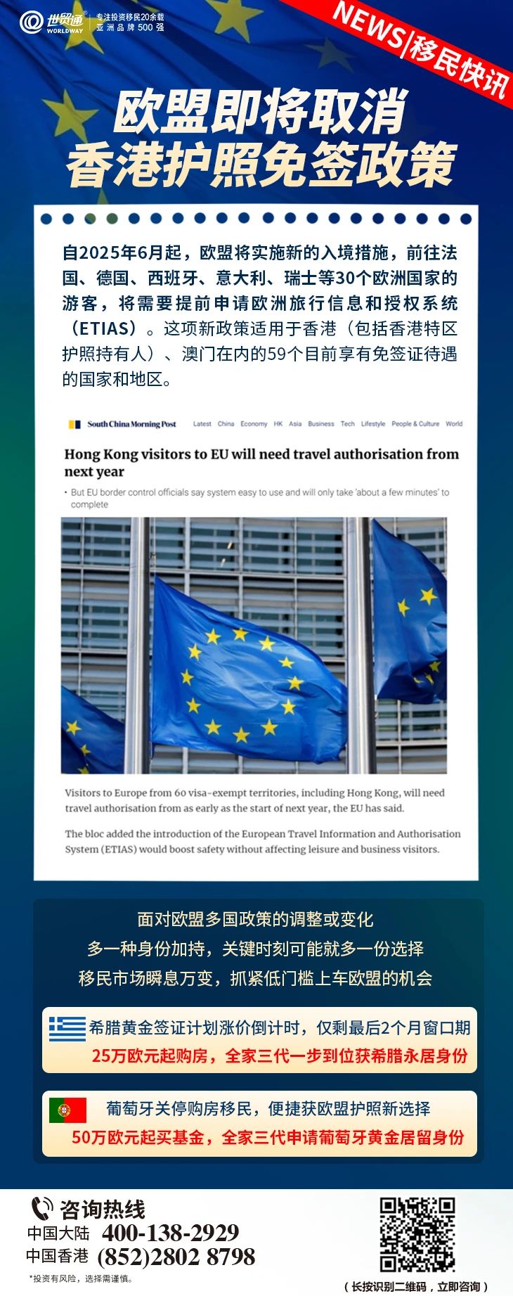 最新消息!欧盟将实施新的入境措施,2025年6月起将引入“ETIAS”,即欧洲旅行信息和授权系统。目前享有免签入境的旅客(包括香港特区护照持有人)在入境法国、德国、希腊、葡萄牙等30个国家前,需预先在网上申请电子旅行许可证ETIAS。